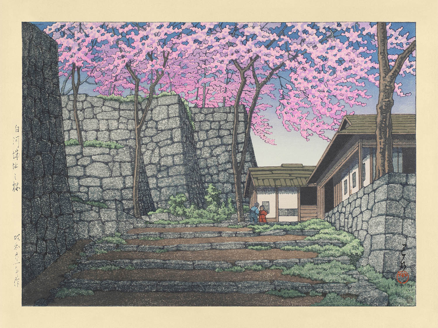 Les cerisiers en fleurs aux ruines du château de Shirakawa, créé en 1935 par le célèbre artiste japonais Hasui Kawase, est un exemple serein et évocateur du mouvement shin-hanga. Intitulée en japonais 白河城跡の桜 (Shirakawajō-ato no Sakura), cette œuvre dépeint la beauté éphémère des cerisiers en fleurs du printemps parmi les pierres silencieuses des ruines historiques du château de Shirakawa. Hasui Kawase est célébré pour avoir infusé les paysages japonais de lyrisme et de sentiment, de sorte que les scènes à la fois anciennes et modernes sont rendues avec une révérence poétique.