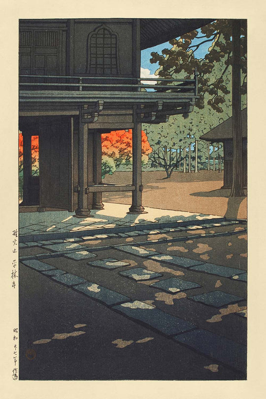 La palette de couleurs de cette œuvre est classique mais vibrante : des verts riches dominent, embrassant le sens de la forêt luxuriante et de la nouvelle vie, tandis que des oranges beurrés et des bruns chauds animent la structure du temple et le sol de la forêt. L'utilisation signature de Hasui de la lumière douce de fin de journée crée des poches de calme et de mouvement, invitant à la quiétude et à la contemplation. Des dégradés subtils et des textures d'estampe sur bois donnent vie à la scène, faisant de cette impression un trésor durable pour les amateurs d'art japonais et les amoureux des paysages intemporels.