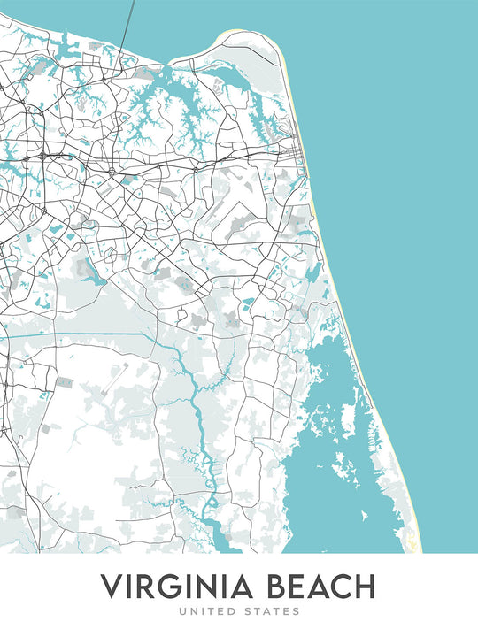 Cette carte de Virginia Beach, créée par The Unique Maps Co. en 2024, est un plan de rue moderne et détaillé qui capture l'essence de cette ville côtière dynamique. La carte couvre une partie importante de Virginia Beach, y compris le centre-ville animé, les quartiers résidentiels sereins et les belles plages qui bordent l'océan Atlantique.