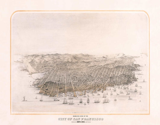 Cette carte d'oeil d'oiseaux remarquablement belle et intéressante montre la ville "Boomtown" de San Francisco en 1868 après avoir subi une expansion massive après la ruée vers l'or précédemment dans les années 1800. La carte a été créée et publiée par Snow & Roos. Cette carte est extrêmement rare - il n'y a peut-être que 1 ou 2 copies de la carte d'origine existant.