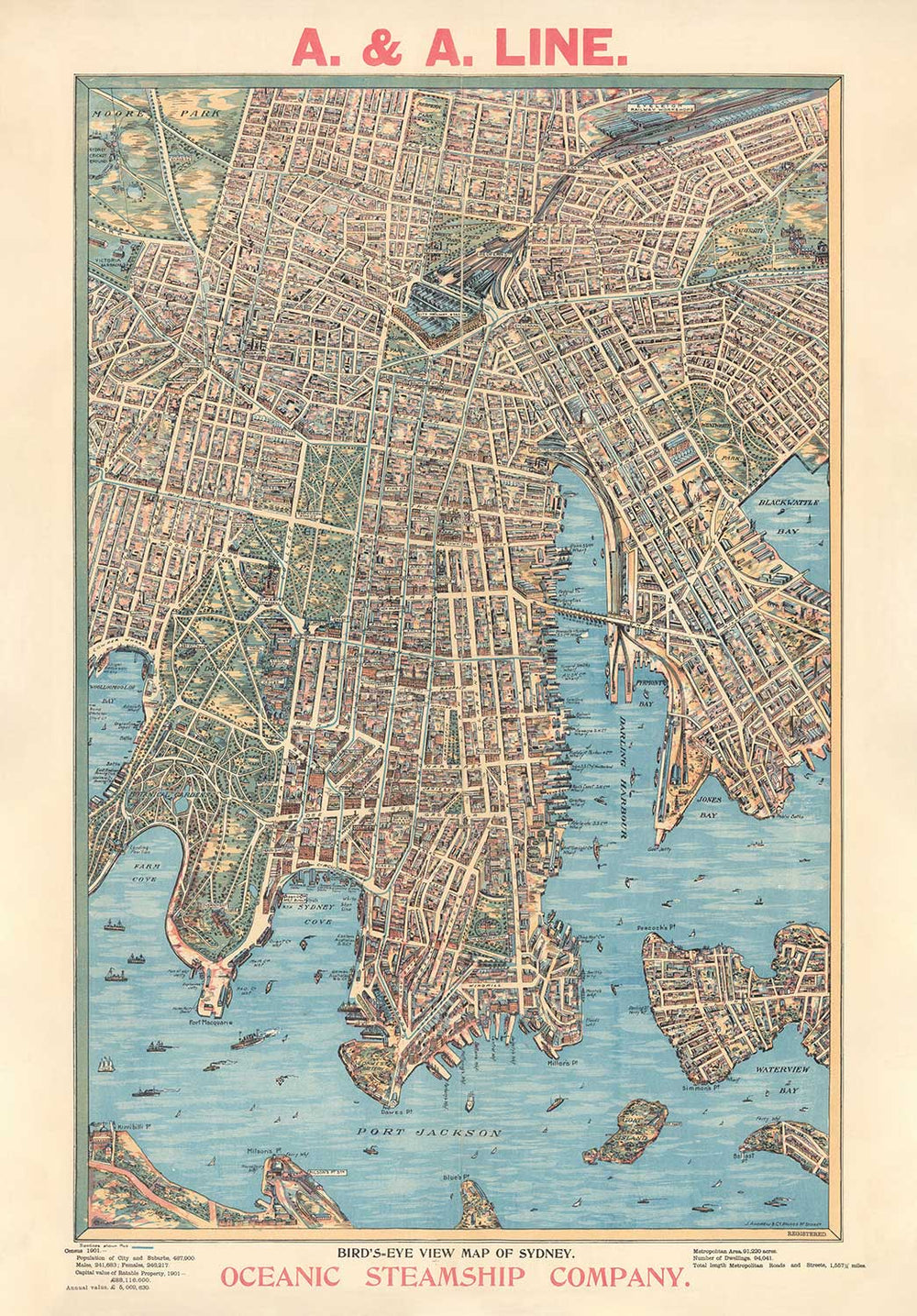 Les lignes de tramwaques, les quais, les lignes de chemin de fer, les routes nommées et sans nom sont toutes représentées - et, dans une belle touche, certains chiffres du recensement de 1901 sont également représentés le long du bord inférieur. Par exemple, il y avait 94 041 habitations - et une population de 487 900 habitants.