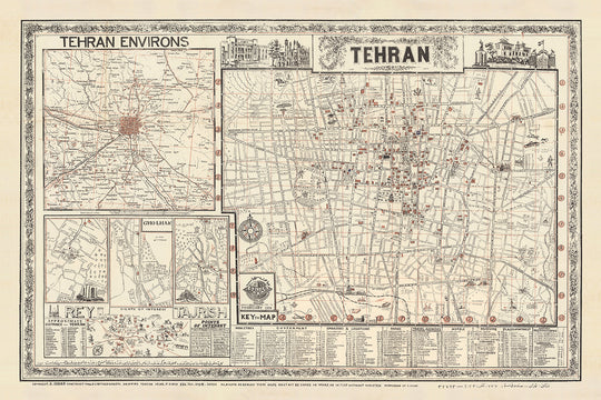 Cette belle carte détaillée de Téhéran réalisée par Sahab Abbas offre un aperçu fascinant du passé de la ville. Créée à l'origine en 1956, cette carte montre la ville de manière très détaillée, avec ses nombreuses rues, quartiers et points de repère clairement indiqués. Voici les cinq éléments les plus significatifs représentés sur cette carte :