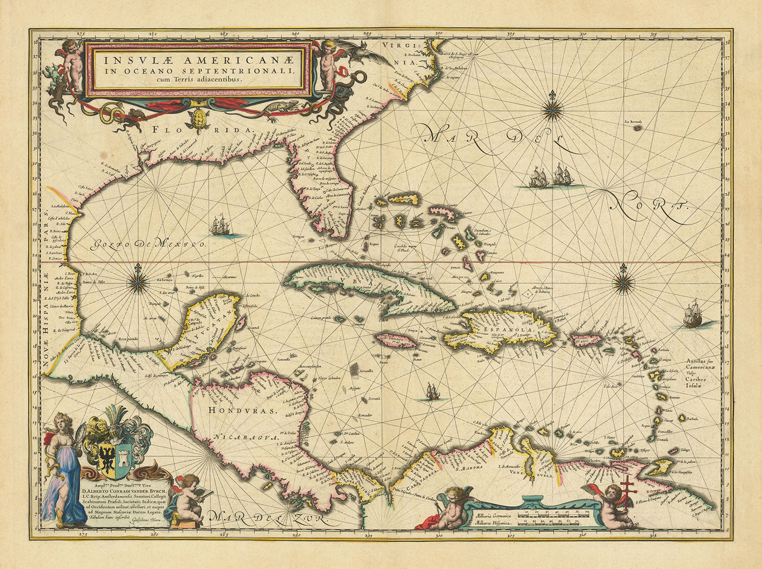 Accueil de plages de sable, de récifs et de forêts tropicales, cette carte des îles des Caraïbes et des pays nord et sud-américains environnants montre à quel point les choses ont peu changé en presque 400 ans.