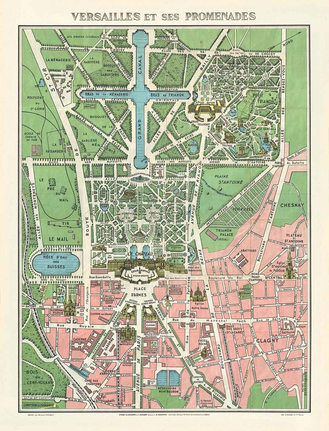 Une carte très colorée qui démontre la taille massive et la grandeur de Versailles. En tant qu'ancienne résidence royale construite entre 1631 et 1634 par le roi Louis XIV, elle est aujourd'hui connue pour son jardin, son architecture et ses caractéristiques aquatiques (y compris les spectacles de jardin musicaux). C'est l'un des sites les plus visités en France.