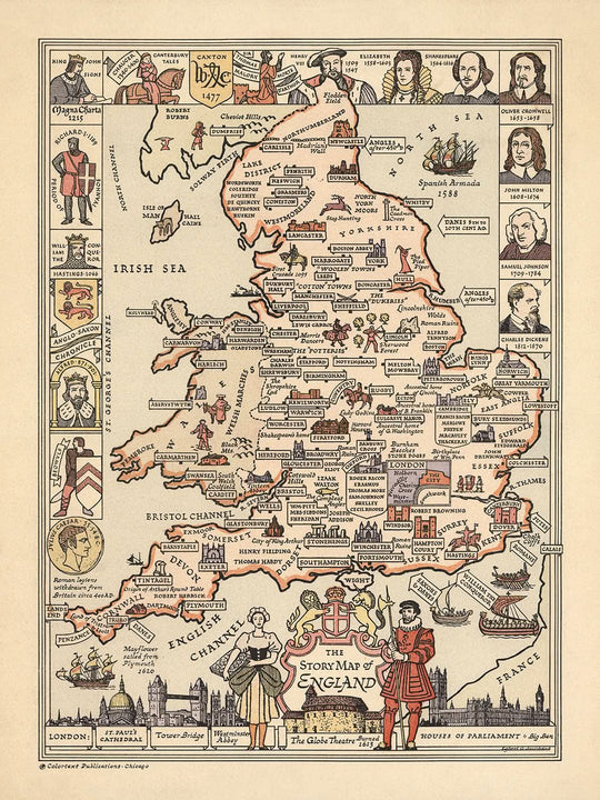 Les monuments d'importance historique et culturelle sont mis en avant, y compris Stonehenge, le Globe Theatre et les emblématiques Chambres du Parlement. Ces sites ne sont pas simplement des points sur une carte, mais sont illustrés de manière complexe, capturant leur essence et leur importance dans l'histoire de l'Angleterre. La carte célèbre également le patrimoine littéraire et politique du pays, avec des portraits de figures influentes telles que Shakespeare et Oliver Cromwell ornant ses bordures, fournissant contexte et profondeur au récit historique.