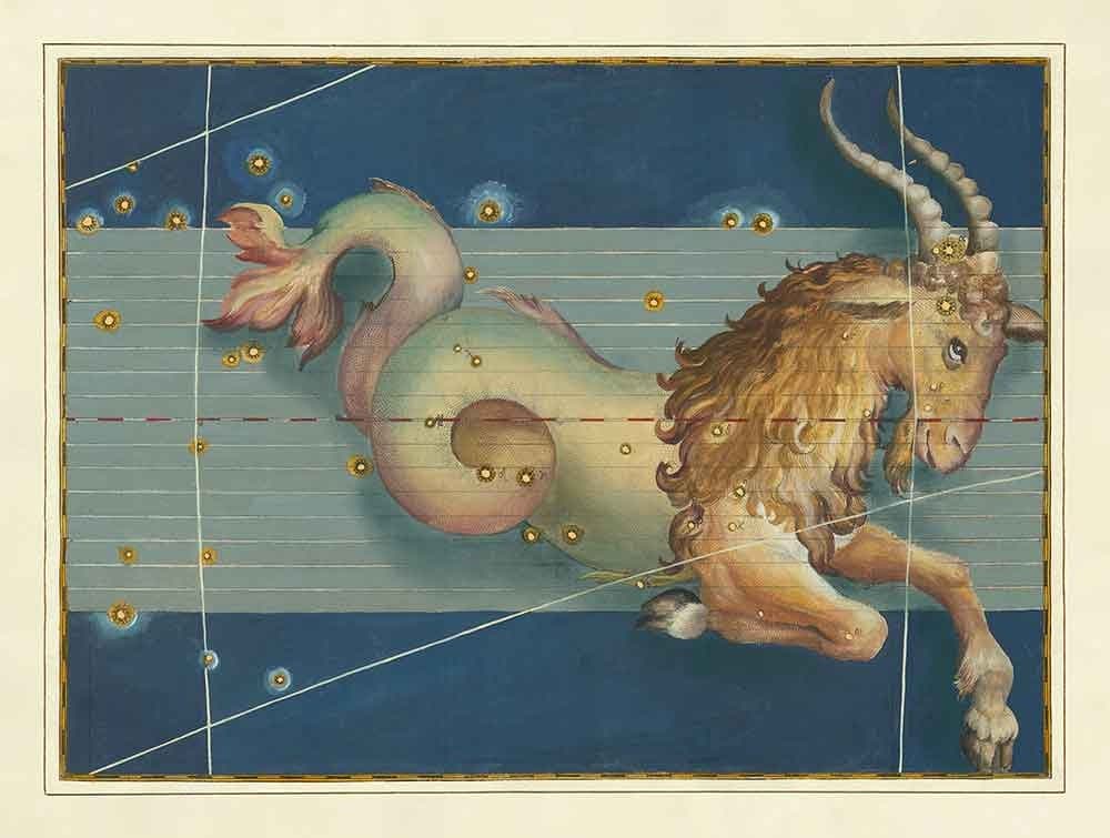 Cette carte des étoiles a été publiée à l'origine en 1603 dans "Uranometria" de Johann Bayer, peut-être l'atlas des étoiles le plus influent jamais publié et le précurseur de tous les atlas modernes. Il contenait 51 cartes des étoiles très précises, dont 48 étaient les constellations ptolémaïques. Et, bien sûr, les 12 principaux signes du Zodiaque, y compris ce charmant Capricorne, étaient tous inclus.