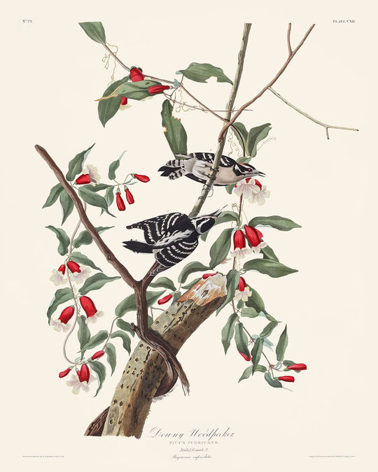 L'œuvre d'Audubon est très appréciée en raison de sa capacité à combiner précision scientifique et grâce artistique. Le pic mineur, ou Picus pubescens, connu pour sa nature industrieuse et son habitat largement réparti à travers les États-Unis, est magnifiquement représenté dans cette illustration. L'œuvre capture l'essence du comportement naturel du pic, toujours diligent dans sa tâche de perforation de l'écorce des arbres, jouant un rôle vital dans la santé des forêts et des arbres fruitiers.