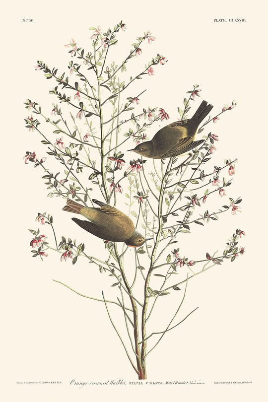 Cette œuvre est remarquable non seulement pour sa représentation de la paruline à couronne orange (Sylvia celata), mais aussi pour sa description détaillée de l'environnement naturel de l'oiseau au sein de la myrtille (Vaccinium frondosum), une partie importante de son habitat. L'illustration capture les parulines au milieu de leurs schémas migratoires dynamiques et de leurs comportements complexes observés par Audubon à travers les paysages variés de l'Amérique.