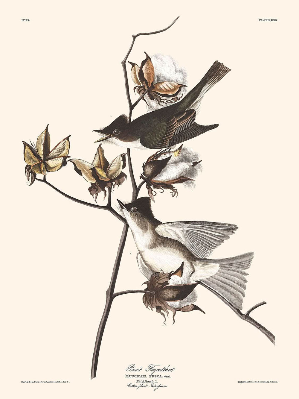 Le Moucherolle de Pewit est remarquable non seulement pour son intérêt scientifique, mais aussi pour la qualité artistique de sa représentation par Audubon. Audubon a capturé des détails infimes des habitudes et de la morphologie uniques de l'oiseau, comme la construction inhabituelle de ses nids et ses habitudes migratoires particulières. Les couleurs de cette œuvre, avec des bruns olivâtres foncés contrastés par des tons plus clairs, créent un visuel riche et texturé qui est à la fois attrayant et éducatif pour les amateurs d'art et les naturalistes.