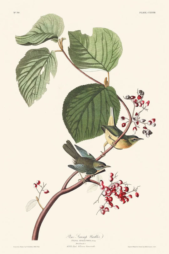 Cette œuvre d'art met en valeur le caractère et la coloration distincts de la paruline bleue à gorge noire (Sylvia canadensis). La précision texturale d'Audubon nous permet d'admirer ces oiseaux non seulement dans leurs poses naturelles, mais aussi dans des contextes riches en récits, illustrant ses capacités d'observation aiguës.
