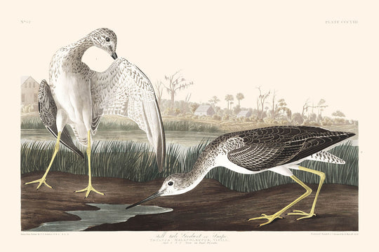 La "Barge à queue noire, ou Bécassine" est une illustration exemplaire connue pour son attention aux détails et sa représentation sophistiquée de l'oiseau, également désigné scientifiquement sous le nom de Tetanus melanoleucus. Cette œuvre reflète l'originalité et le charme subtil de l'oiseau, capturant ses tons terreux et grisâtres familiers qui se mêlent à des touches vibrantes de plumage doré. Le choix des couleurs d'Audubon et la posture dynamique de l'oiseau mettent en avant son cri distinctif et sa nature loquace à travers la tranquillité de l'art.