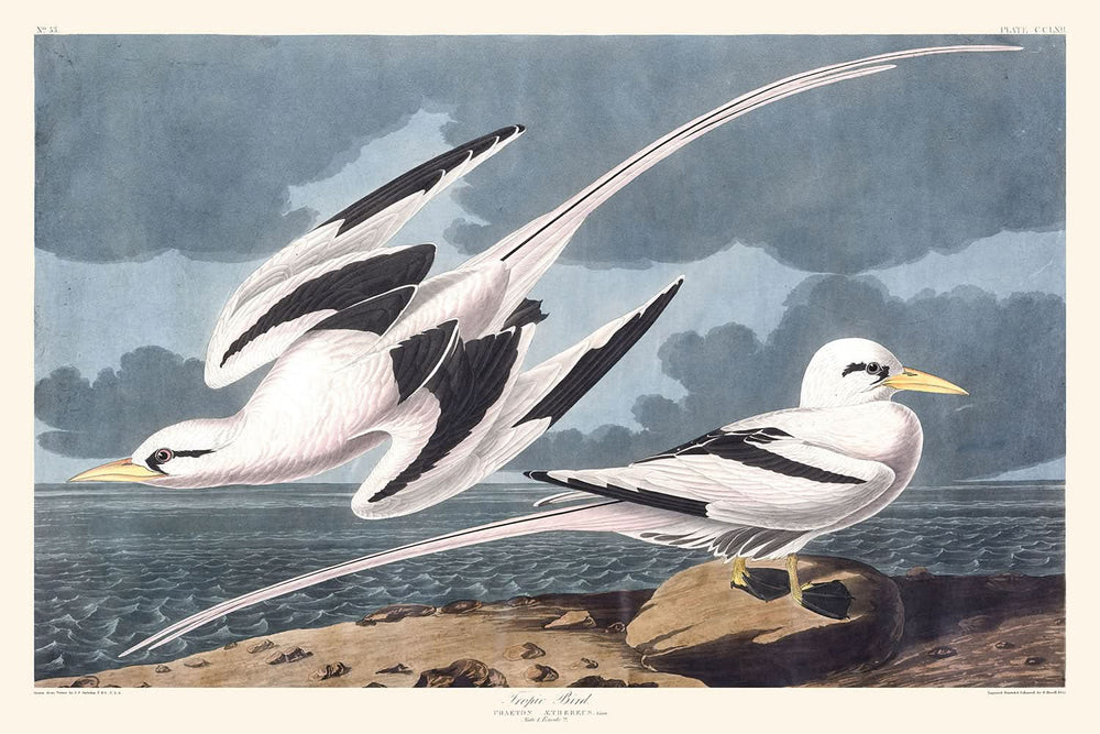 L'illustration de « Tropic Bird » est particulièrement remarquable pour sa représentation détaillée du mâle et de la femelle Phaeton aethereus, qui capture avec précision leur plumage nuptial. Ces illustrations sont basées sur des spécimens obtenus par l'associé d'Audubon, Robert Day, au cours de l'été 1832. La précision et l'attention portée aux détails dans cette œuvre soulignent l'engagement d'Audubon envers l'excellence ornithologique et la beauté artistique.