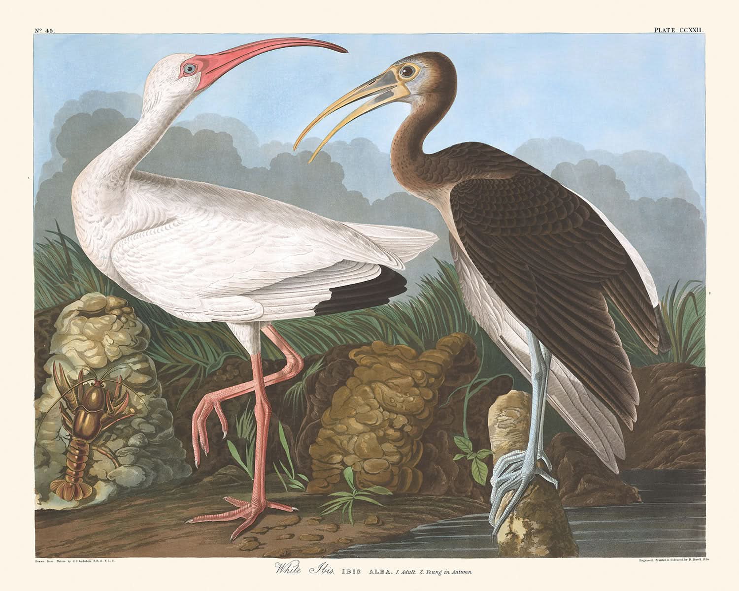L'Ibis blanc (planche 222) de John James Audubon, publié en 1827, témoigne du talent et du dévouement d'Audubon pour l'ornithologie. Cette illustration saisissante fait partie de son ouvrage historique, « Les oiseaux d'Amérique », connu pour sa grandeur et ses descriptions détaillées de la vie aviaire.