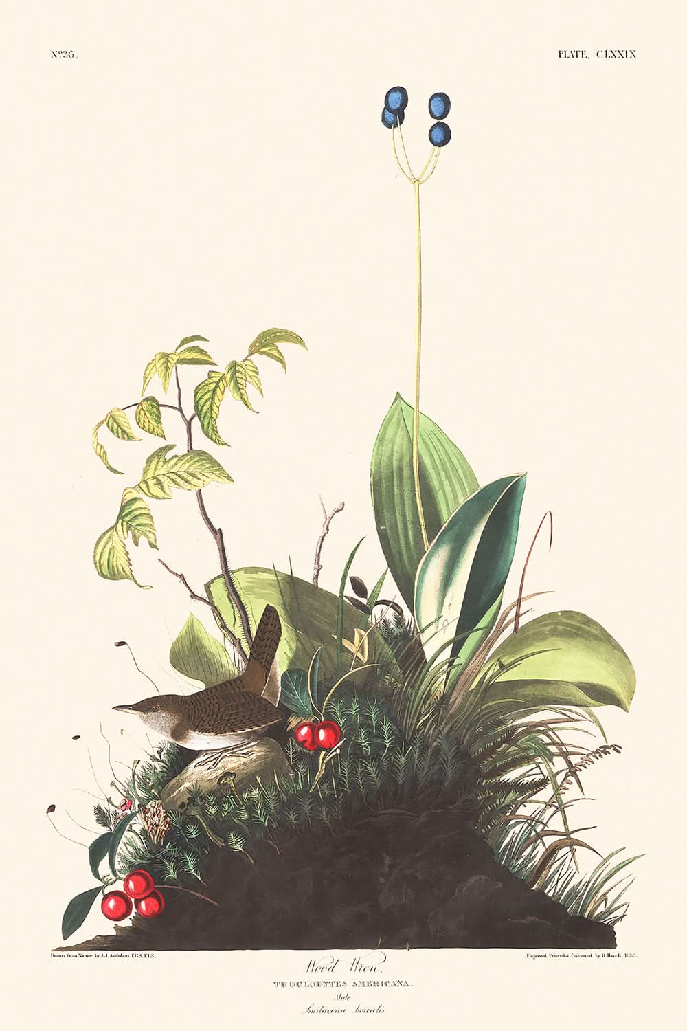Les caractéristiques esthétiques de l'estampe du Troglodyte des bois comprennent son riche plumage brun rougeâtre subtilement entrelacé de teintes grises et sa composition mesurée reflétant les nuances comportementales de l'oiseau. Pour les collectionneurs d'œuvres d'Audubon, le Troglodyte des bois (scientifiquement nommé Troglodytes Americana) offre un témoignage essentiel de la richesse descriptive et de la profondeur contextuelle pour lesquelles Audubon était célèbre.