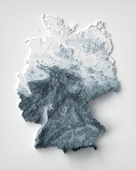La géographie de l'Allemagne est une tapisserie de contrastes : le sud est défini par des sommets alpins redoutables et des vallées glaciaires étincelantes, leurs hauts plateaux modelés avec précision par des ombres nettes. En se déplaçant vers le nord, le pays s'ouvre sur des plateaux expansifs et des vallées fluviales fertiles, y compris le Rhin sinueux, le Danube et l'Elbe, dont les chemins sculptés sont élégamment tracés sur la surface de la carte. Le pays central élevé, avec sa forêt de Thuringe et les collines volcaniques de l'Eifel et du Hunsrück, émerge avec une richesse tactile, soulignant les subtils changements qui rendent ces régions uniques.
