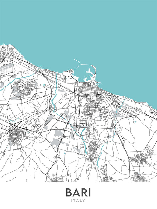 Cette carte de Bari, créée par The Unique Maps Co., est une merveille moderne qui capture l'essence de cette ville italienne dynamique. En mettant l'accent sur l'esthétique et le design intérieur, cette carte n'est pas seulement un outil de navigation, mais une œuvre d'art qui ajoutera une touche de sophistication à n'importe quelle maison ou bureau. La carte couvre une partie importante de Bari, y compris le quartier historique de Bari Vecchia, connu pour ses rues étroites et son architecture ancienne, ainsi que les quartiers plus modernes de Carrassi et San Pasquale.
