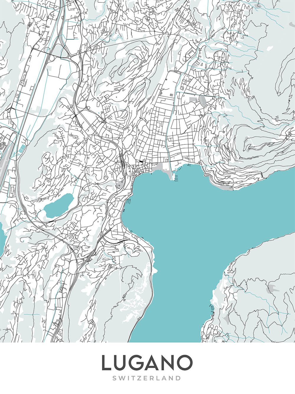 Ce plan de Lugano est un plan de rue moderne et détaillé, sans étiquettes, axé sur la ville et ses environs. Il couvre une vaste zone, comprenant le centre-ville, les quartiers environnants, ainsi que les montagnes et les lacs voisins. La carte est conçue pour être à la fois informative et visuellement attrayante, ce qui en fait un excellent ajout à toute maison ou bureau.