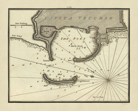Ancienne Civitavecchia, Italie Carte Nautique par Heather, 1802: Port, Château, Phare
