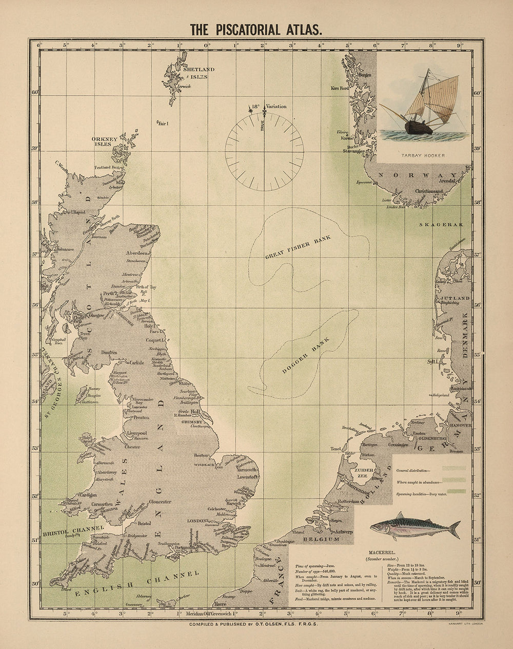 Cette carte plutôt unique du Piscatorial Atlas par O.T Olsen montre des informations détaillées sur la pêche en mer du Nord à la fin du 19e siècle.