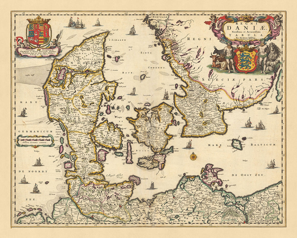 Ancienne carte du Danemark par Visscher, 1690 : Göteborg, Copenhague, Hambourg, Malmö, parc national de la mer des Wadden