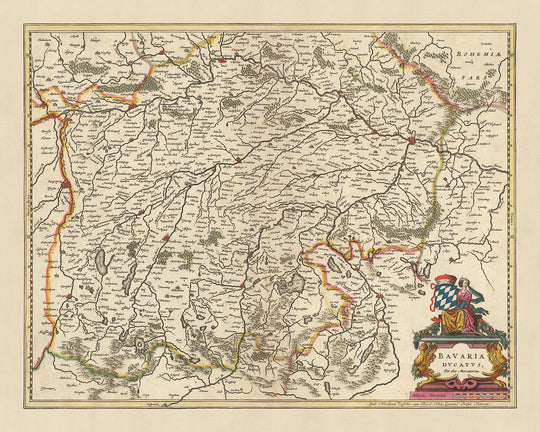 Plongez dans la riche histoire du duché de Bavière avec cette carte méticuleusement élaborée par Nicolaes Visscher II, un cartographe renommé du siècle d'or néerlandais. Créée en 1690, cette carte, connue sous le nom de « Bavaria Ducatus » ou « Duché de Bavière » en anglais, fournit un aperçu approfondi des divisions politiques et des subtilités régionales de ce territoire allemand historique.