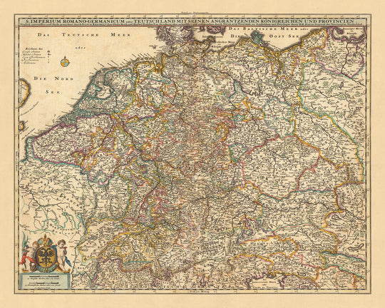 Cette carte extrêmement détaillée, intitulée 'S. Imperium Romano- Germanicum : oder Teutschland mit seinen angrantzenden Konigreichen und Provincien', est un témoignage des compétences cartographiques de Nicolaes Visscher II, un cartographe renommé du Siècle d'or néerlandais. Le titre, traduit en anglais, se lit comme suit : « Le Saint Empire romain germanique : ou l'Allemagne avec ses royaumes et provinces adjacents », et résume la vaste étendue de l'Europe centrale couverte par la carte.
