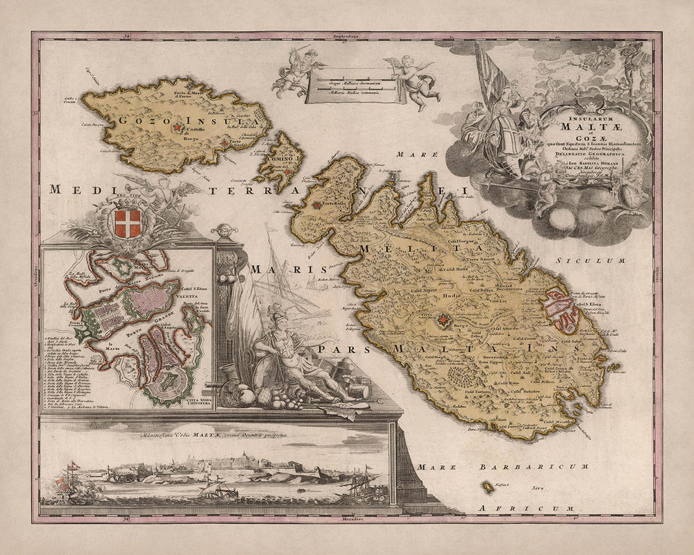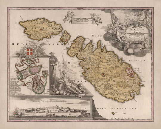 Les éléments artistiques de la carte sont aussi captivants que ses détails géographiques. Le cartouche décoratif, orné de figures allégoriques, ajoute une couche de sophistication artistique. Ces illustrations, ainsi que la représentation de thèmes navals, enrichissent le récit de la carte, offrant des aperçus sur le milieu culturel et historique de l'époque. L'inclusion des armoiries de Malte souligne encore l'identité et l'importance de l'île.