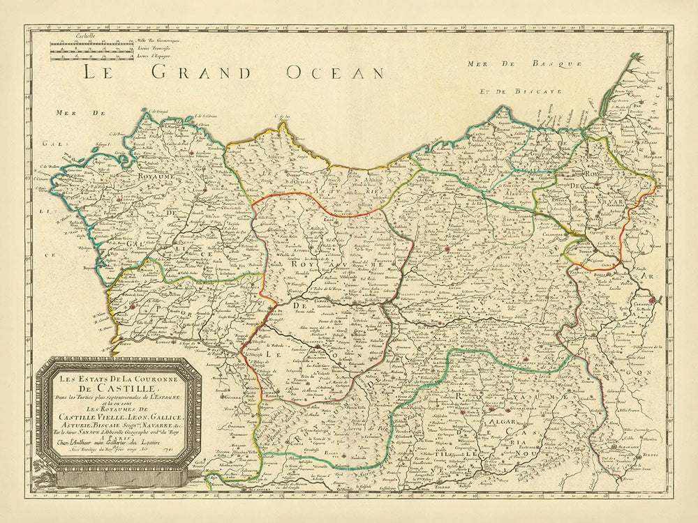 La carte illustre de manière vivante la géographie diversifiée du nord de l'Espagne, des chaînes de montagnes escarpées aux rivières sinueuses telles que le Duero et l'Ebre. Les côtes de la baie de Biscaye et de l'océan Atlantique sont méticuleusement détaillées, invitant les spectateurs à explorer la beauté naturelle et l'importance stratégique de ces régions. Les frontières entre les territoires historiques sont marquées par des lignes colorées, offrant des aperçus sur le paysage politique de l'époque.