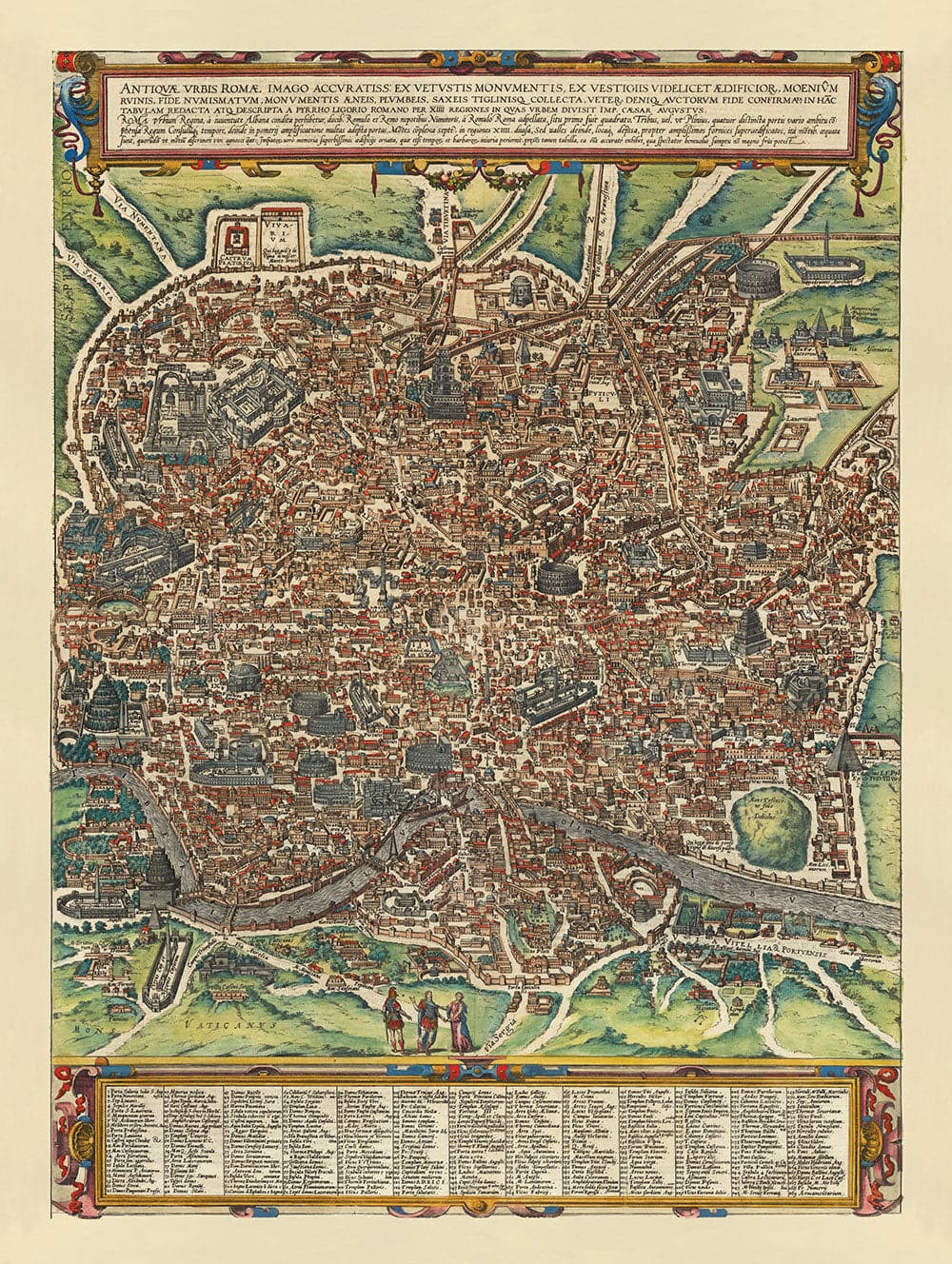 Ancienne carte de Rome, 1588 par Georg Braun: Forum, Panthéon, Circus Maximus, Colisée, Vatican