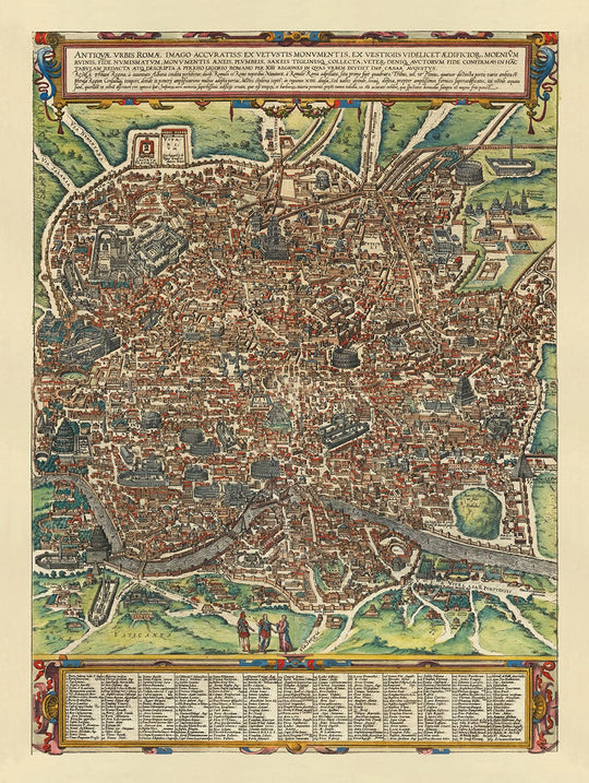 Tous les anciens monuments romains sont visibles sur cette carte, y compris le Forum Romain, le Colisée, le Circus Maximus, l'Hippodrome, le fleuve Tibre, le Panthéon et le Castel Sant'Angelo (appelé ici le Mole d'Hadrien).