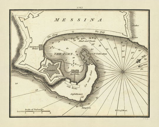 Ancien Messine, Sicile Carte Nautique par Heather, 1802: Citadelle, Fort St. Salvador, Salines
