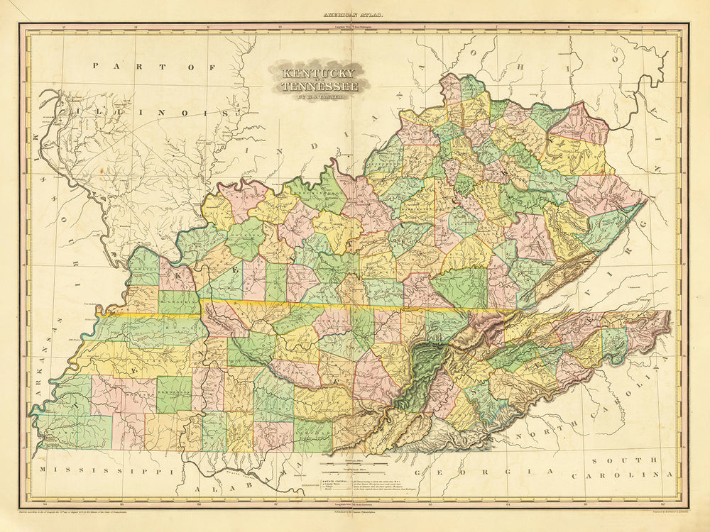 Ancienne carte du Kentucky et du Tennessee par H.S. Tanner, 1820, comprenant Nashville, Louisville, Lexington, Knoxville et Chattanooga