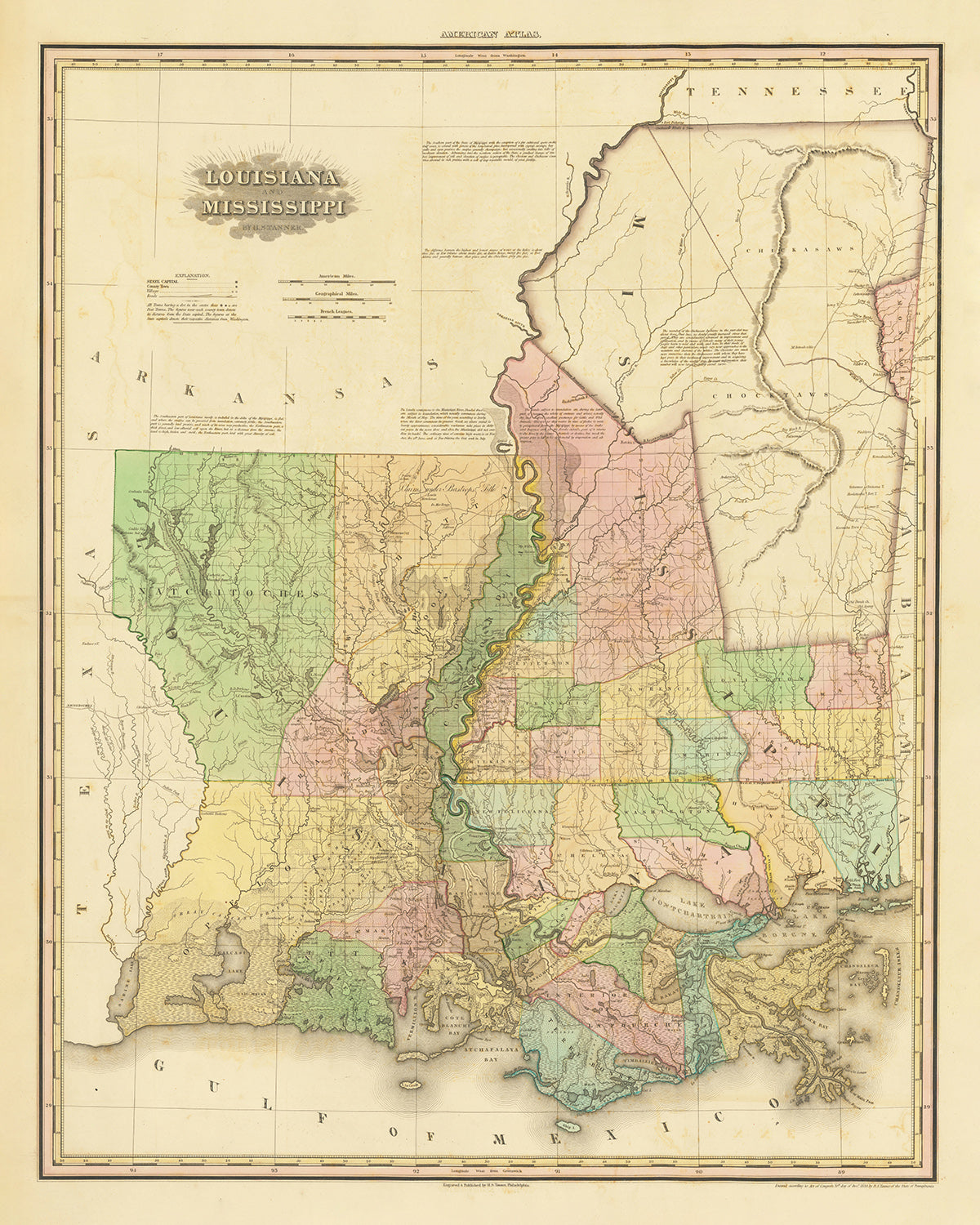 Ancienne carte de la Louisiane et du Mississippi par H. S. Tanner, 1820: Nouvelle-Orléans, Baton Rouge, Jackson, Gulfport et Lafayette