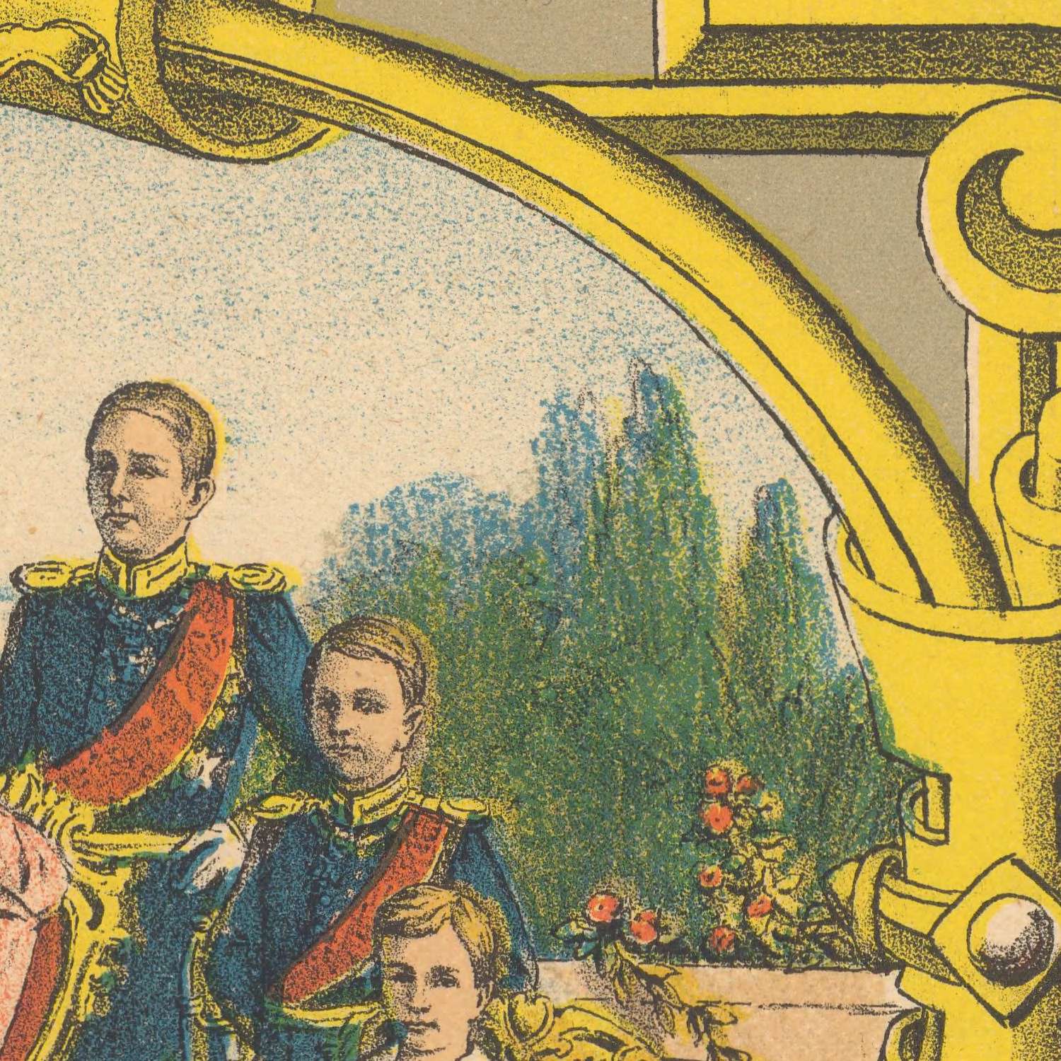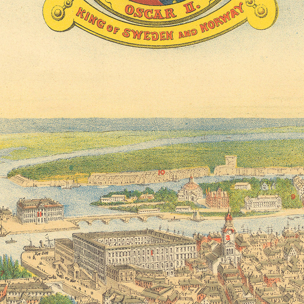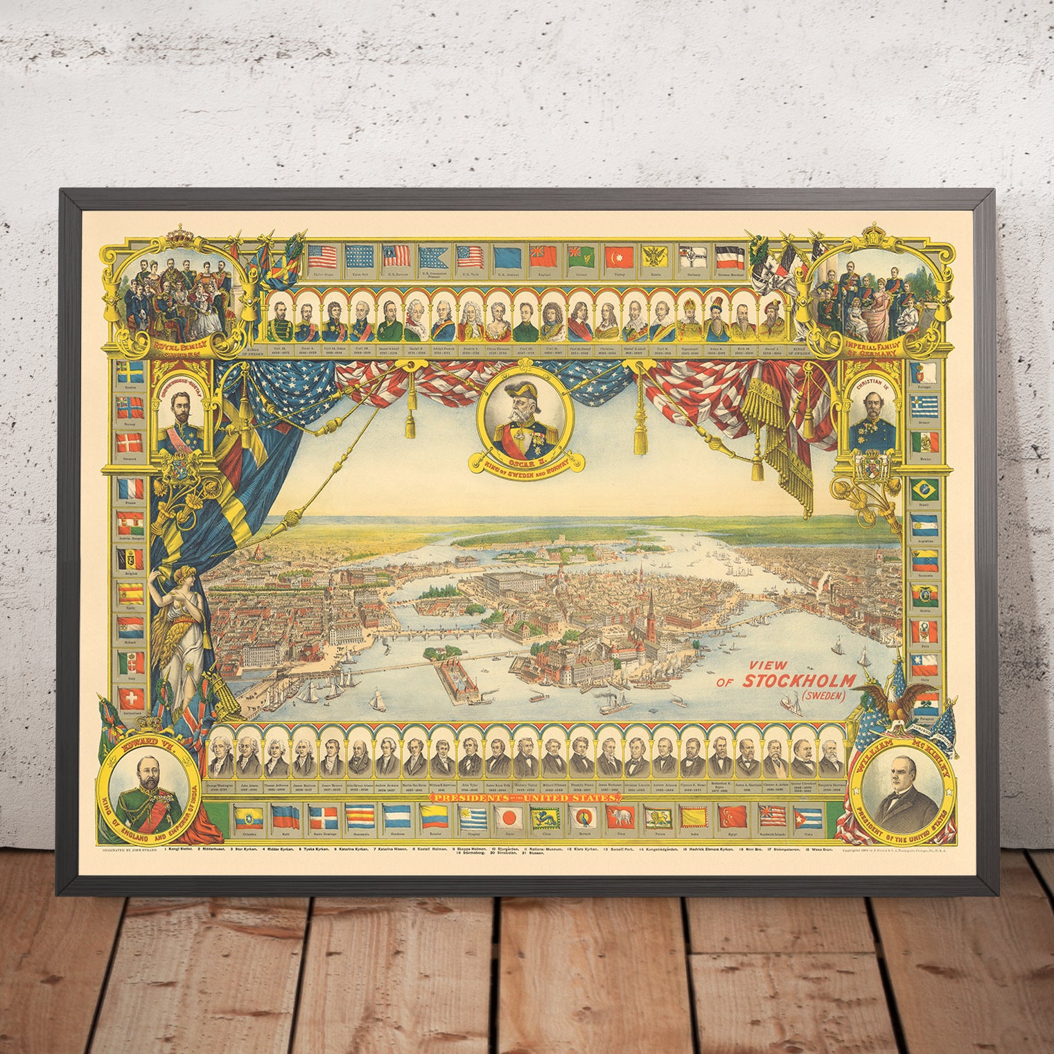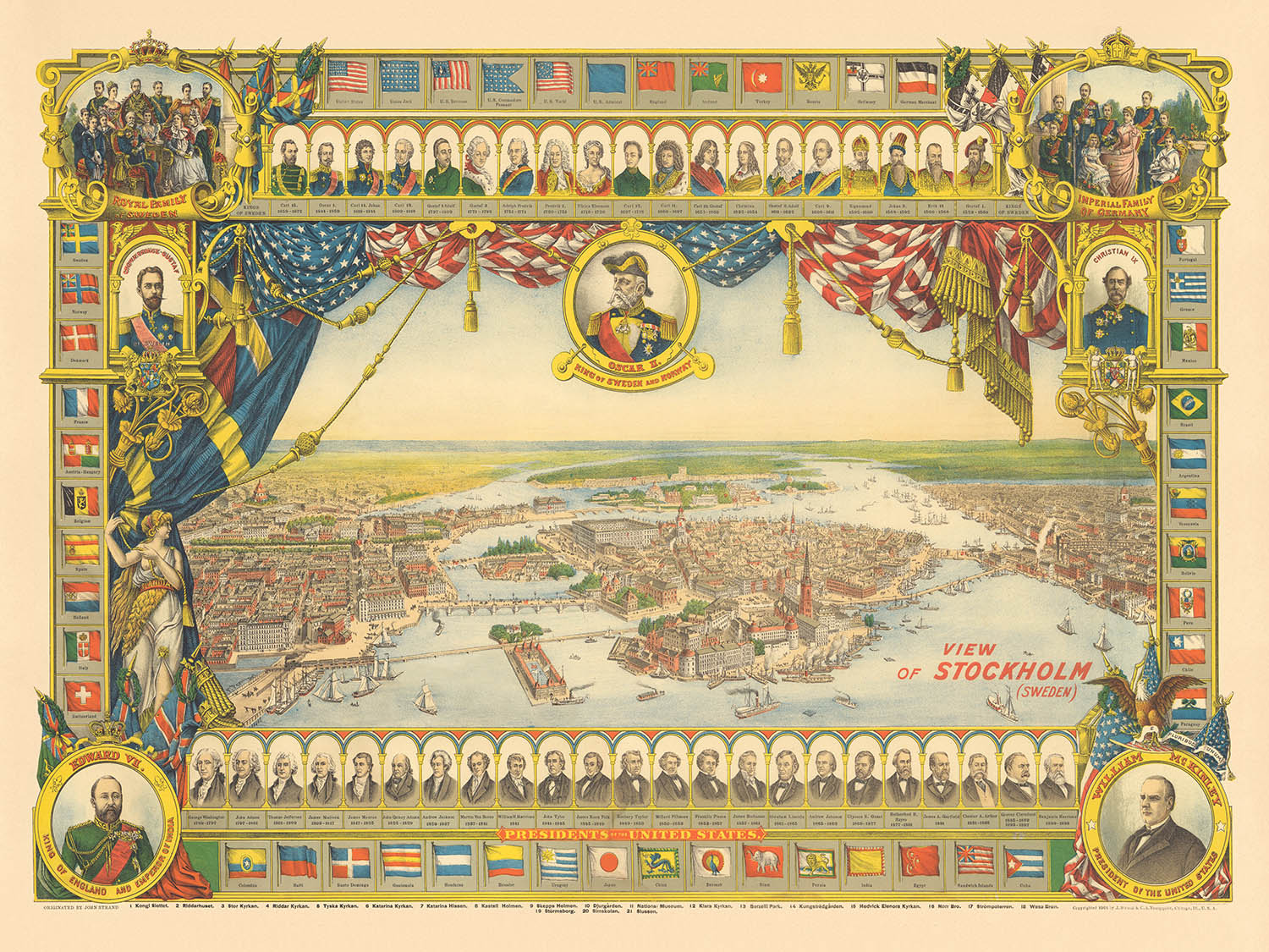 Commissioned in 1901 and published in Chicago by John Strand and C.A. Youngquist, the work reflects the cosmopolitan networks binding Scandinavia and the Swedish-American diaspora. Sherwood Lithograph Co.—a pioneer in offset lithography—translates Pezolt’s draftsmanship into crisp, saturated detail, allowing architecture and shoreline to read with painterly clarity. An ornate border deepens the narrative: allegorical figures, banners of Sweden and the United States, and a comparative chronology of Swedish monarchs and American presidents wrap the view in a frame of history. The result is a cartographic keepsake that functions as both guide and cultural envoy.