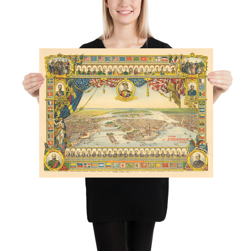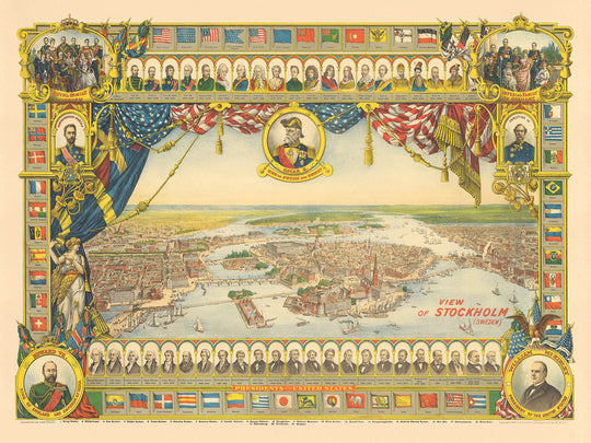 The timing of the view is equally evocative. Issued the year Stockholm hosted the First Nordic Games and inaugurated the Nobel Prizes, it captures a capital stepping confidently onto the world stage. Portraits of the Swedish royal family—highlighting Crown Prince Gustav—signal continuity amid modernization, while the parade of international flags and political figures frames the city in a wider diplomatic tableau. The allegorical figure of Scandinavia presides above a metropolis in transition: industrial vitality meeting courtly tradition, civic monuments balanced by cultural ambition. In this light, the map reads as a manifesto of 1901 Stockholm—urbane, outward-looking, and poised between heritage and innovation.