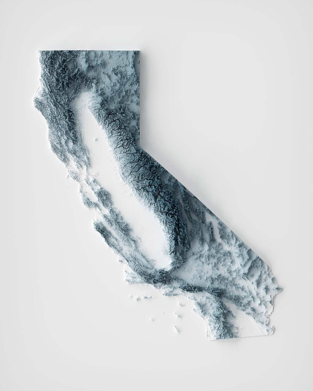 La Californie, lorsqu'elle est présentée de cette manière unique, révèle de manière spectaculaire ses points forts topographiques. Le plus évident, bien sûr, est la Grande Vallée, la Vallée de Sacramento et la Vallée de San Joaquin au centre, entourées par les immenses sommets des montagnes de la Sierra Nevada à l'est et les chaînes côtières élevées à l'ouest.