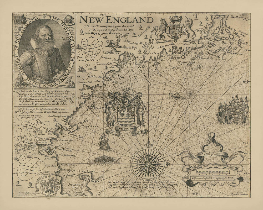 Première carte de la Nouvelle-Angleterre par John Smith, 1616: Boston, Plymouth, Cape Ann, design baroque orné