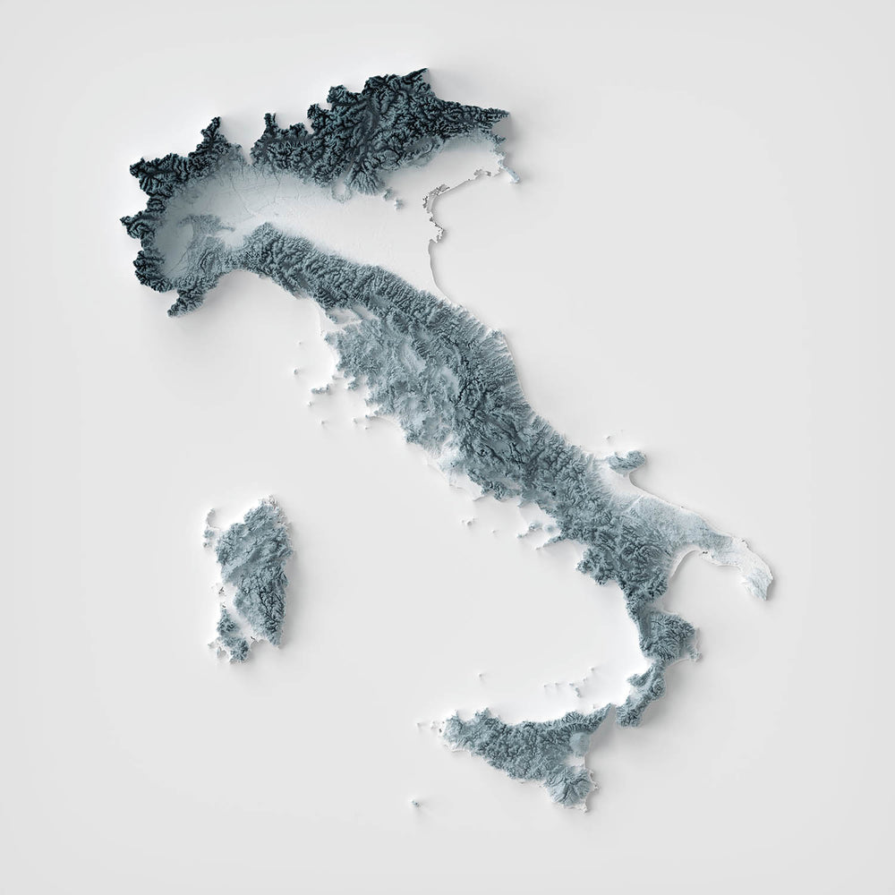 Célébrez la beauté frappante de l'Italie avec cette carte topographique très détaillée, un hommage à la magnifique géographie et aux paysages diversifiés du pays. Contemplez la célèbre péninsule en forme de « botte » et vous reconnaîtrez instantanément comment les chaînes de montagnes, les collines ondulantes, les plaines fertiles et les côtes scintillantes se rejoignent dans une terre renommée pour son drame naturel.