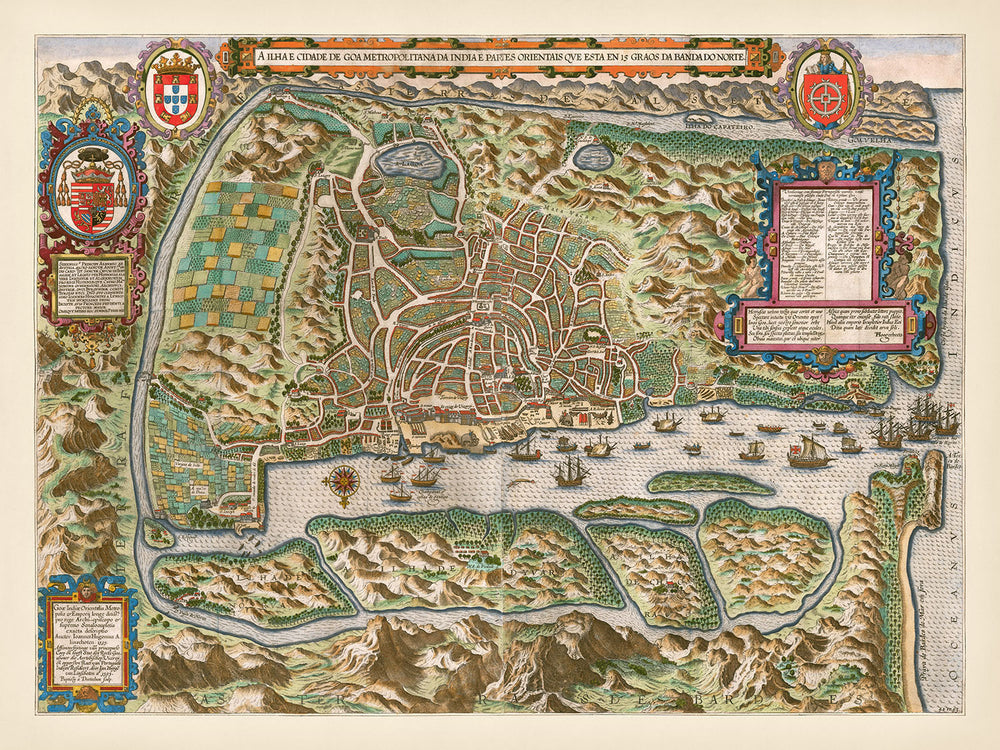 La carte de Goa est riche en caractéristiques notables, y compris le dense réseau de rues de la ville et des monuments significatifs. Les fortifications le long du port et du périmètre de la ville soulignent l'importance stratégique de Goa dans la protection des intérêts portugais. Plusieurs églises, représentées avec précision architecturale, soulignent le rôle de la ville en tant que centre religieux. Le port lui-même, grouillant de divers navires, met en avant l'activité maritime vibrante qui a fait de Goa un nœud crucial dans les réseaux commerciaux mondiaux.