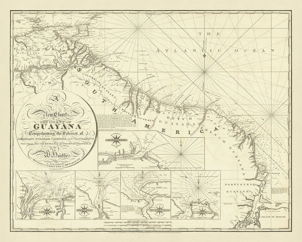 - Encarts : Cartes plus grandes de l'entrée du fleuve Orénoque, d'Essequebo, du fleuve Berbice, du fleuve Surinam et de Cayenne.