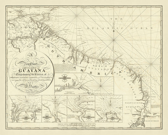 L'une des caractéristiques les plus frappantes de cette carte est la série de cartes encartées qui offrent un aperçu plus détaillé des entrées et des ports clés des rivières. Ces encarts comprennent l'entrée du fleuve Orénoque, Essequebo, le fleuve Berbice, le fleuve Surinam et Cayenne. Chaque encart est soigneusement conçu pour offrir des informations détaillées sur la topographie et les défis de navigation de ces voies navigables vitales. Cette attention aux détails reflète le dévouement du cartographe à la précision et à l'utilité, ce qui en fait un outil indispensable pour comprendre l'histoire maritime de la région.