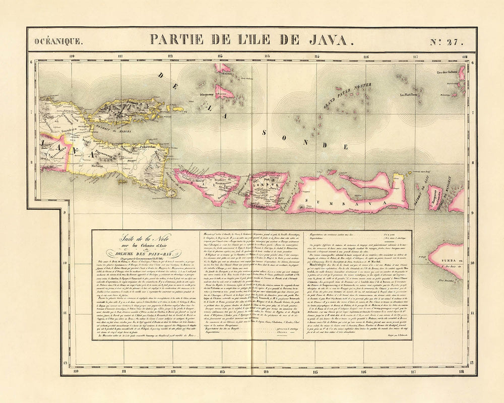 Le travail de Delavault est un témoignage de l'intérêt croissant de l'époque pour l'exploration mondiale et l'expansion coloniale. La carte est accompagnée d'un texte perspicace discutant des territoires coloniaux néerlandais en Asie, offrant un aperçu des dynamiques géopolitiques de l'époque. Dans le cadre du projet ambitieux de Vandermaelen, cette carte contribue à une narration plus large, mettant en valeur des régions qui étaient autrefois à l'avant-garde des ambitions coloniales européennes. C'est un fascinant mélange d'art et d'histoire, capturant l'esprit d'une époque définie par la découverte et les revendications territoriales.