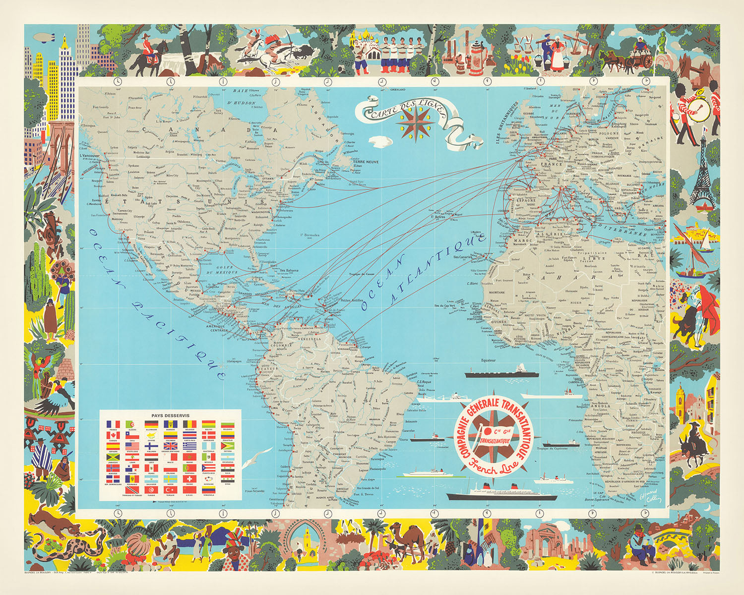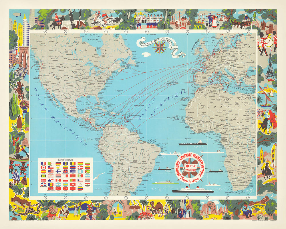 La conception de la carte est un mélange harmonieux de fonctionnalité et d'art. L'utilisation de couleurs vives pour mettre en valeur les routes maritimes et l'inclusion de drapeaux nationaux et d'un tableau des pays desservis par la Compagnie Générale Transatlantique ajoutent des couches d'informations à la fois attrayantes et éducatives. Les éléments picturaux, tels que les illustrations de paquebots et de scènes culturelles, fournissent un récit qui va au-delà des données géographiques, offrant un aperçu du monde des voyages et du commerce internationaux au milieu du XXe siècle.