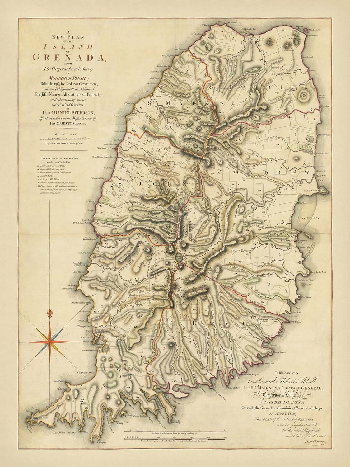Carte rare de la Grenade par Paterson, 1780: St. George's, domaines, rivières, Bedford Point, plantations