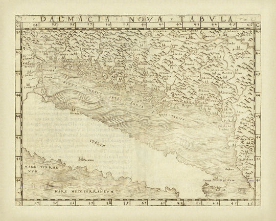 Le champ géographique de cette carte englobe une grande partie de la Croatie actuelle, ainsi que des parties de la Slovénie, de la Bosnie-Herzégovine, du Monténégro, de l'Albanie, et même un aperçu de Venise et de l'Istrie. La mer Adriatique, représentée comme « Mare Adriaticum », domine la scène, sa côte étant ponctuée par l'archipel des îles dalmates. À l'intérieur des terres, des chaînes de montagnes stylisées s'élèvent de manière spectaculaire, tandis que des rivières serpentent vers la mer, reflétant à la fois la grandeur physique et l'importance stratégique de la région. La délimitation soignée des frontières et des caractéristiques naturelles illustre la complexité de ce carrefour entre l'Est et l'Ouest.