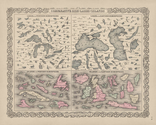 Ce qui distingue cette carte est son approche innovante de l'éducation géographique. Plutôt que de se concentrer sur les frontières politiques ou les villes, elle présente un tableau mondial des lacs et îles les plus significatifs de la Terre, regroupés par hémisphère et rendus dans des couleurs harmonieuses. La carte met non seulement en valeur des géants familiers comme le Groenland, Bornéo et le lac Supérieur, mais elle met également en lumière des caractéristiques moins couramment représentées telles que le Grand Lac Salé riche en sel et le lac Mono. Chaque plan d'eau et masse terrestre est positionné pour faciliter une comparaison visuelle directe, rendant cette carte aussi intellectuellement stimulante que visuellement frappante.
