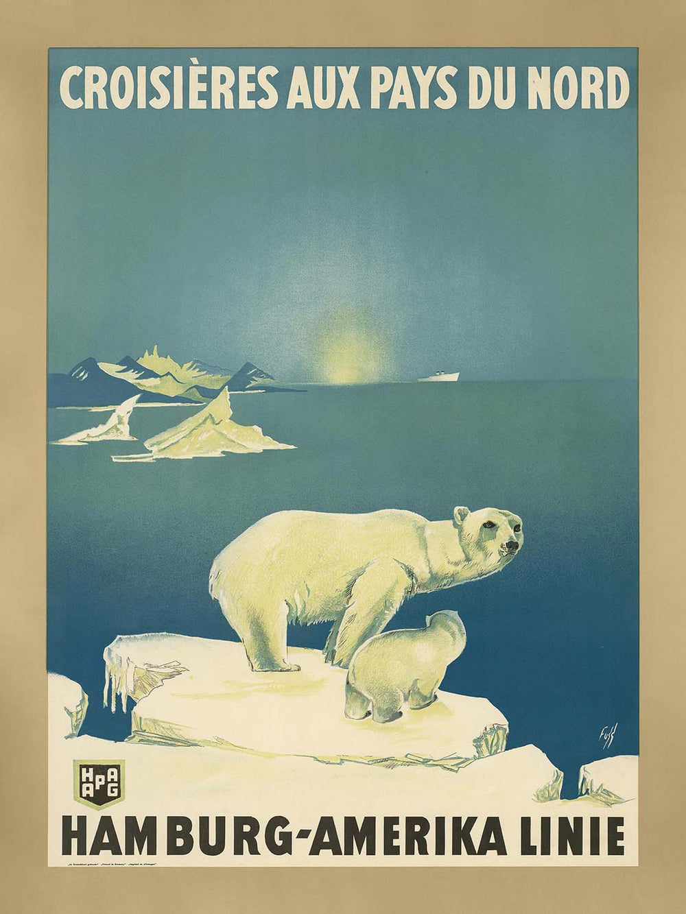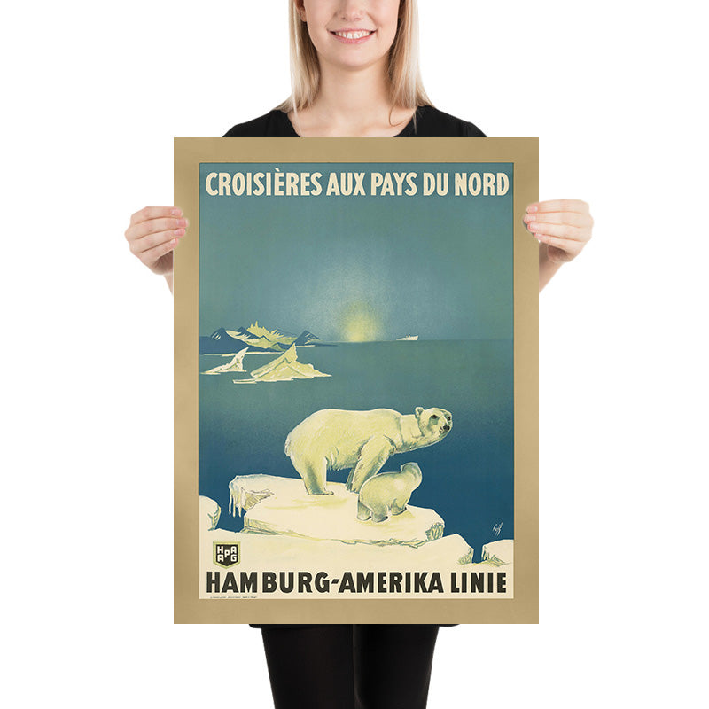 Croisières aux Pays du Nord; Hamburg-Amerika Linie by Albert Fuss (1930) is a quintessential Art Deco travel poster from the golden age of ocean voyages. Created to promote Hamburg-Amerika Linie’s “Northern Countries” cruises, its French headline signals a campaign aimed at Francophone travelers bound for Scandinavia and the North Atlantic. The composition balances crisp geometry and maritime romance: the title CROISIERES AUX PAYS DU NORD is set in bold caps across the top, while HAMBURG-AMERIKA LINIE anchors the lower portion—a clear visual hierarchy that directs the eye through bands of cool blue, clean white, and sun-washed yellow evocative of northern light and sea air.