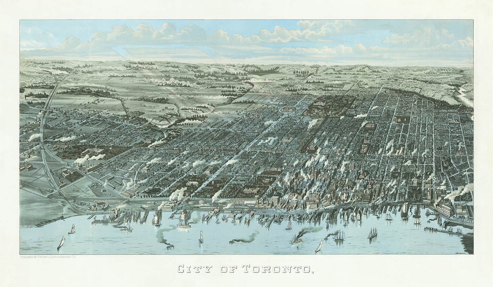 Les points de repère abondent dans cette vue historique, chacun rendu avec une précision qui donne vie au passé de la ville. Les flèches imposantes de la cathédrale St. James et de l'Église unie métropolitaine dominent le ciel, tandis que les terrains majestueux de l'Université de Toronto et la verdure luxuriante de Queen's Park offrent un soulagement visuel au milieu de l'agitation urbaine. Le long du front de mer, le port animé et les dépôts ferroviaires témoignent du statut de Toronto en tant que plaque tournante industrielle et de transport vitale, avec des quais et des jetées s'étendant dans le lac Ontario et des trains serpentant à travers le bord ouest de la ville. Les terrains de l'Exposition, visibles à l'ouest, laissent entrevoir le rôle de la ville en tant que lieu de rassemblement pour la célébration et l'innovation.