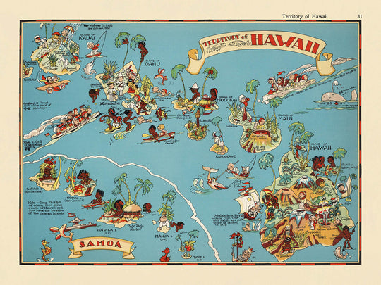 Un examen plus attentif de la carte révèle une riche gamme de repères naturels et culturels. Des volcans majestueux, représentant probablement le légendaire Kilauea ou Mauna Loa, explosent d'énergie, tandis que des plages bordées de palmiers et une flore tropicale évoquent la beauté paradisiaque des îles. L'océan grouille de pirogues à balancier et de vie marine, reflétant le lien profond entre les Hawaïens et la mer. Des scènes de vie traditionnelle — pêche, surf et danse — se déroulent aux côtés de caricatures de touristes, capturant l'attrait croissant d'Hawaii en tant que destination d'aventure et de détente. Les bordures de la carte sont ornées d'illustrations thématiques supplémentaires, immergeant encore plus le spectateur dans le monde enchanteur des îles.
