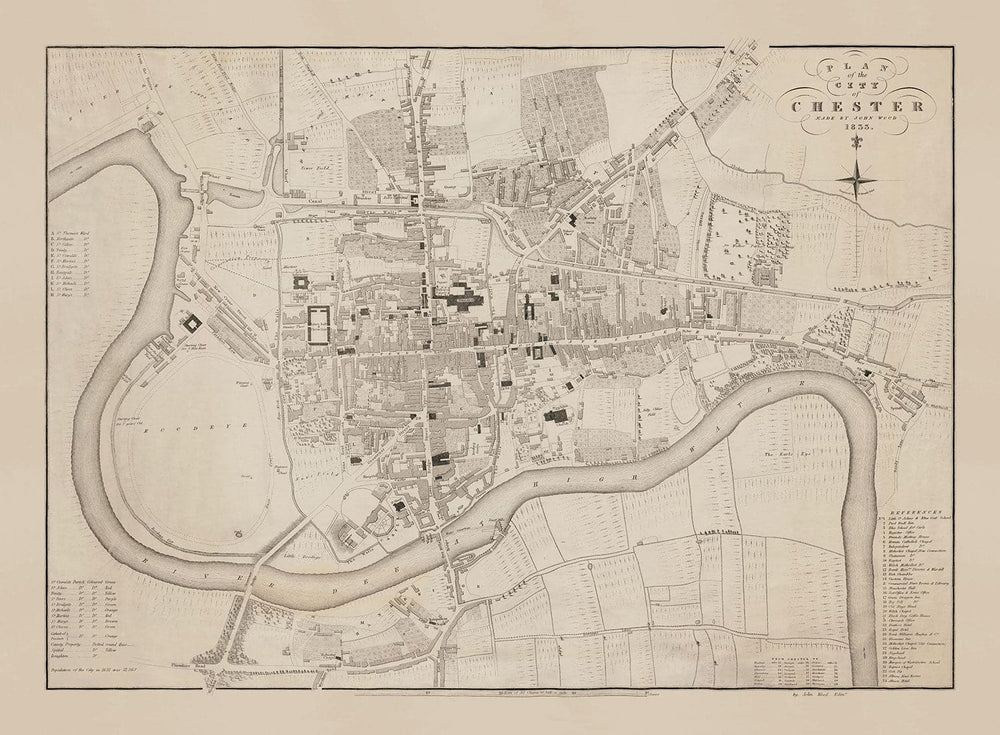 Ancienne carte de Chester, 1833 par John Wood: Cathédrale, Château, Course de course, Murs, River Dee, Centre ville Plan Graphique